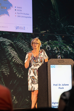 Prof. Dr. Juliane Fluck vom ZB MED - Informationszentrum für Lebenswissenschaften beschäftigte sich als Sprecherin von NFDI4Health in ihrem Vortrag mit den Services und Angeboten der nationalen Forschungsdateninfrastruktur für personenbezogene Gesundheitsdaten. Dr. Fluck verdeutlichte anhand der Vision von NFDI4Health, dass Daten als gemeinsames Gut für exzellente Forschung bereitgestellt werden sollen, sodass die NFDI Nutzungsmöglichkeiten von Daten verbessern, rechtskonforme, interoperable und nachhaltige Dateninfrastrukturen schaffen und die Kompetenz im Umgang mit Daten stärken kann. In ihrem Vortrag zeigte Dr. Fluck, dass es eine heterogene, sehr umfangreiche Datenlage gibt, die aber oftmals nur lokal verfügbar und erst nach Einwilligung von Teilnehmenden an Studien oder nach der Beantragung von Datennutzung zugänglich ist.