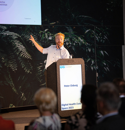 Den ersten Vortrag der Session übernahm Peter Osburg von der Nationalen Koordinierungsstelle für Interoperabilität. Neben der Vorstellung der Roadmap des Interop Councils gab Osburg einen Überblick über die beteiligten Akteure. In seinem weiteren Vortrag machte er deutlich, dass Interoperabilität die Grundvoraussetzung für digitale Gesundheit ist. Durch Versorgung, Prävention und Forschung können die Daten erst auffindbar, zugänglich, anschlussfähig und wiederverwendbar gemacht werden. Hierfür müssen Datensilos aufgebrochen und der Fokus auf die Anwender der Daten sowie die Patienten, die ihre Daten bereitstellen, gerichtet werden.