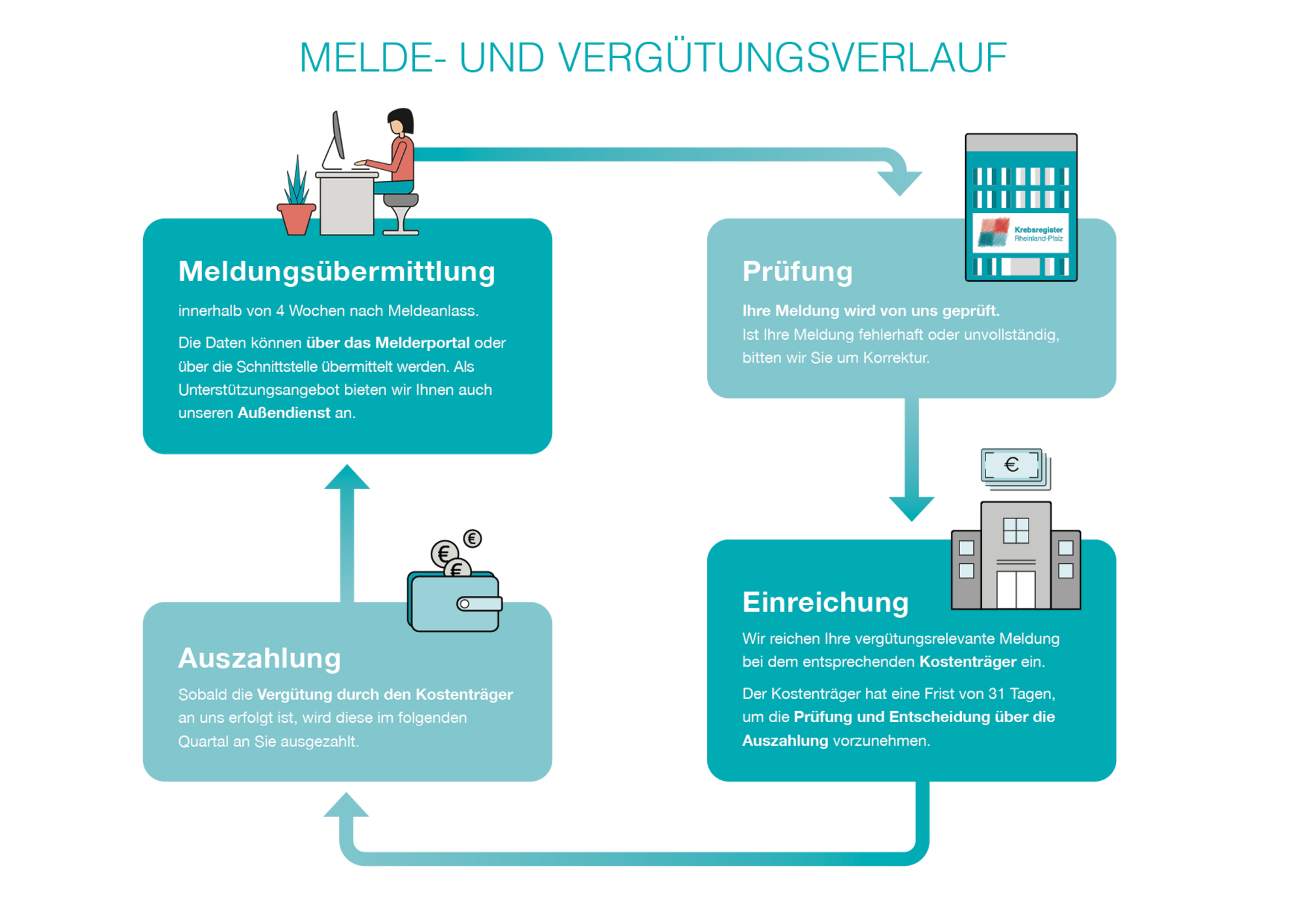 Das Krebsregister RLP rechnet diese Meldevergütung mit dem Kostenträger ab und zahlt sie nach Zahlungseingang an die jeweiligen Melder aus.