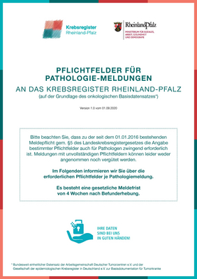 Die Pflichtfelder für Pathologie-Meldungen sind ab dem 01.09.2020 gültig. Durch unser Merkblatt möchten wir Sie noch einmal an die Felder, die zusätzlich zu der Übermittlung der Befundtexte zur jeweiligen Meldung verpflichtend sind, erinnern. Es ist notwendig, dass die Mitarbeiter, die in Ihrem Institut für die Meldungen an das Krebsregister verantwortlich sind, die Meldungen diesem Merkblatt entsprechend auf Vollständigkeit prüfen.