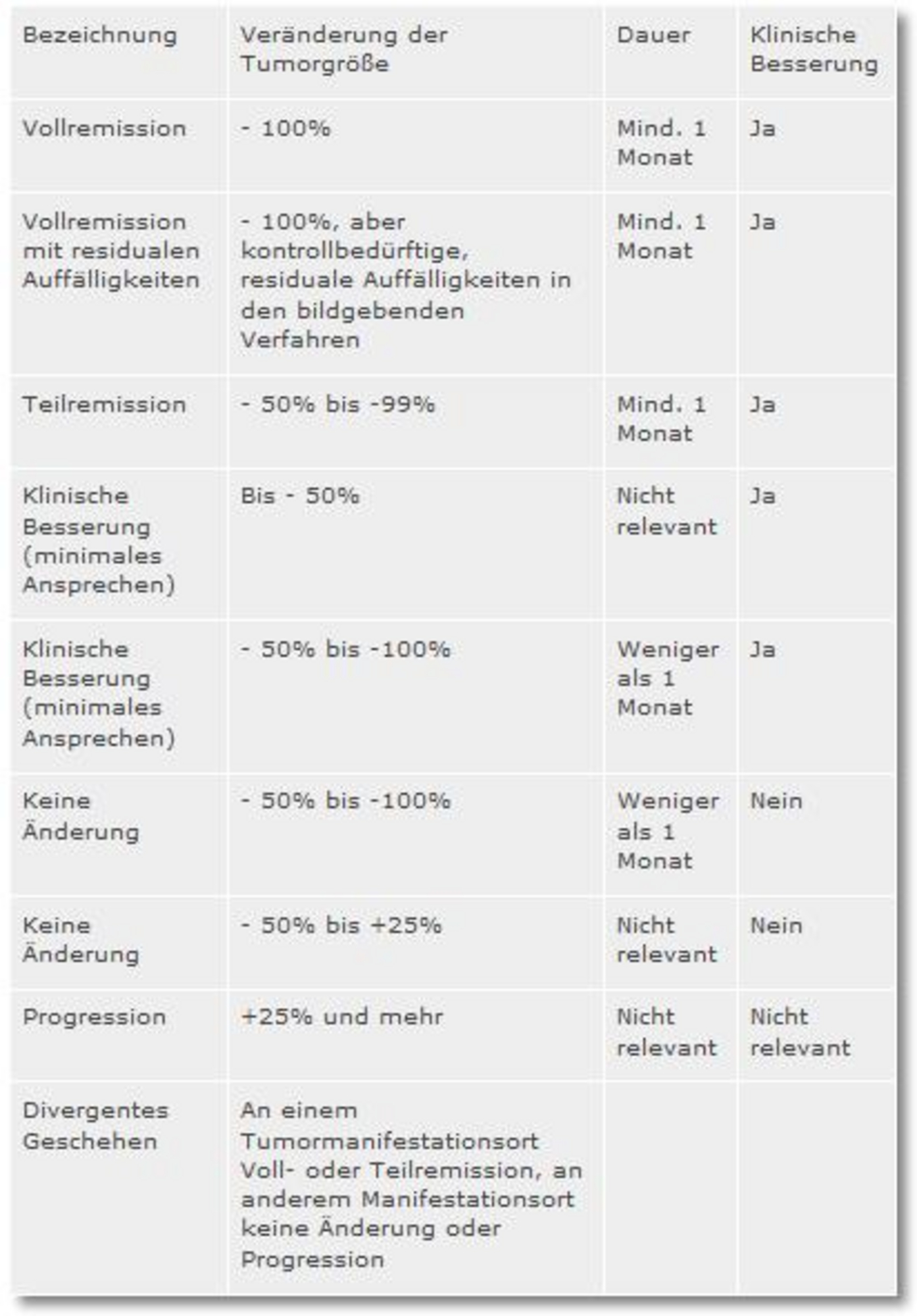 Gesamtbeurteilung Tumorstatus: Wie sind die verschiedenen Begriffe (Vollremission, Teilremission, keine Änderung,…) definiert?