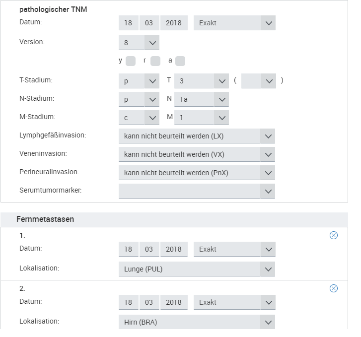 Synchrone Metastasen sind Metastasen, die innerhalb von 92 Tagen nach der Erstdiagnose des Primärtumors auftreten. Sie werden in einer Diagnosemeldung gemeldet. Kodiert werden die Angaben zum Primärtumor mit dem zugehörigen TNM (M1). Die Lokalisation der Fernmetastase wird mit ihrem zugehörigen Diagnosedatum angegeben.