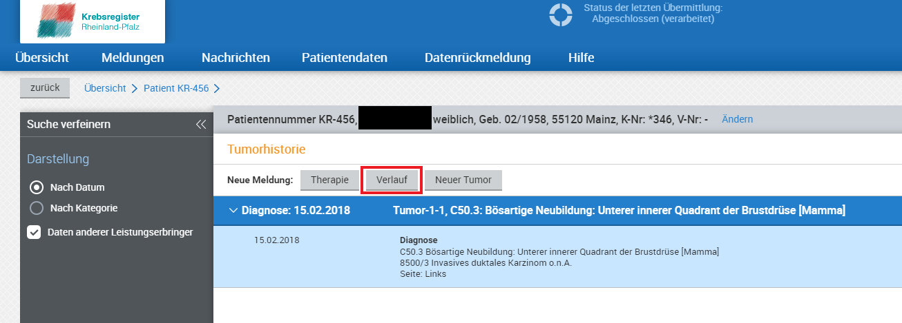 Szenario 1: Der Arzt, der bereits die Diagnose gestellt hat, meldet den Verlauf