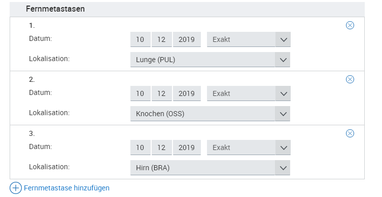 Metachrone Metastasen sind Metastasen, die mehr als 92 Tage nach der Erstdiagnose des Primärtumors auftreten. Sie werden in einer Verlaufsmeldung gemeldet. Hier ist die Angabe der M-Klassifikation (M1) sowie die Lokalisation der Fernmetase und das zugehörige Diagnosedatum anzugeben. Außerdem ist der Tumorstatus der Fernmetastase (Progress, Rezidiv, neu aufgetreten) anzugeben.