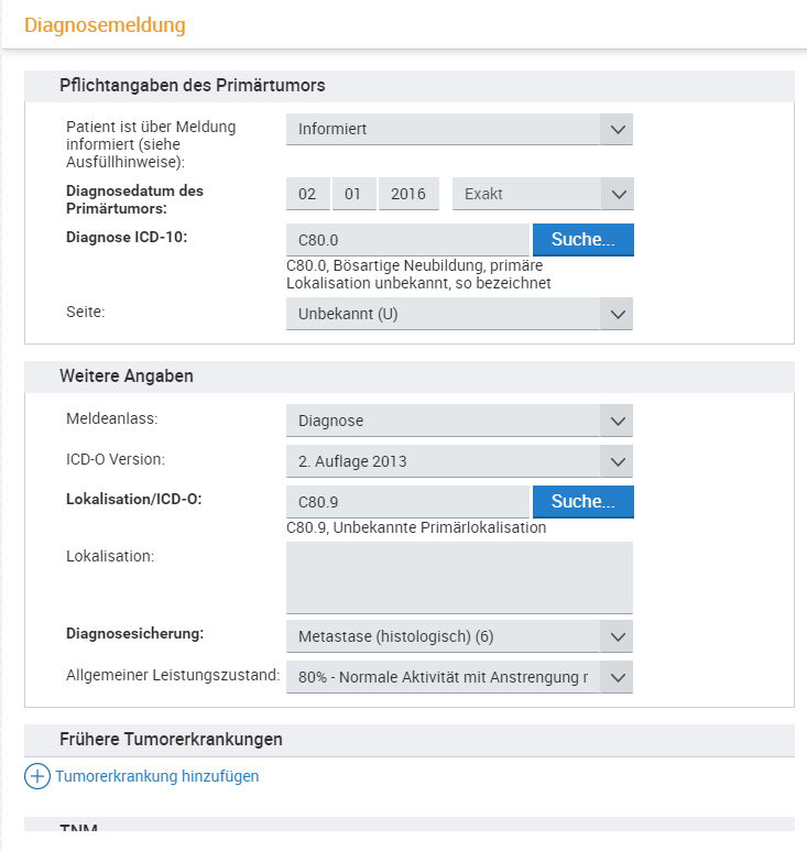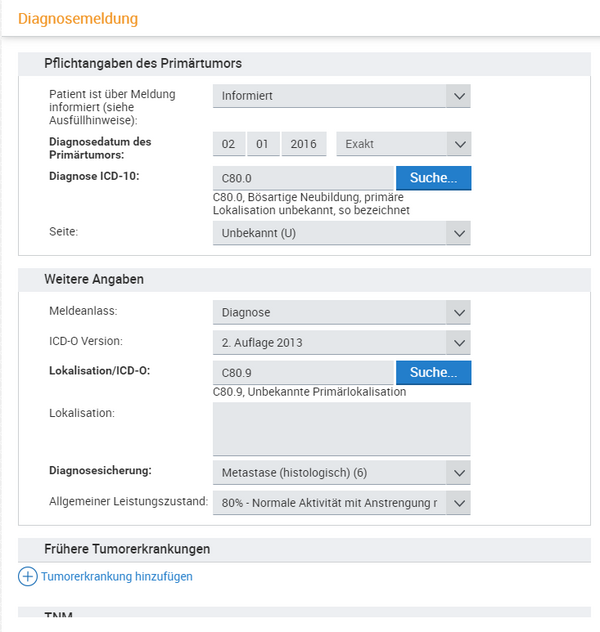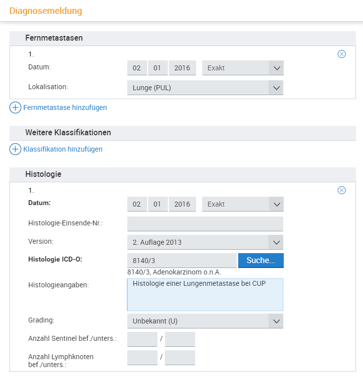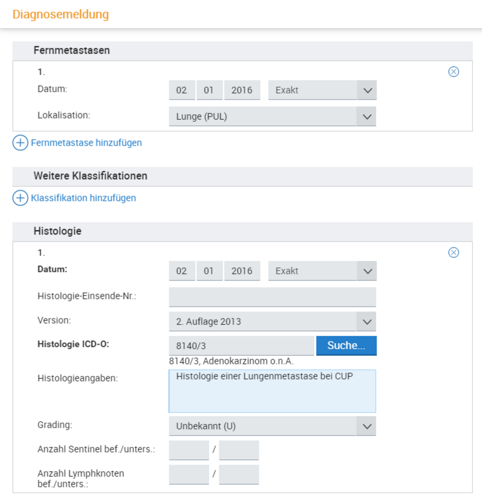 Metastasen werden immer in Bezug auf den Primärtumor gemeldet. Wenn dieser nicht bekannt ist (CUP) , dann wird dieser in der Diagnosemeldung oder in einer Verlaufsmeldung als ICD-10: C80.0 und in der Lokalisation als C80.9 kodiert. Außerdem wird die Lokalisation der Fernmetastase mit dem Diagnosedatum der Fernmetastase in der Meldung eingetragen.