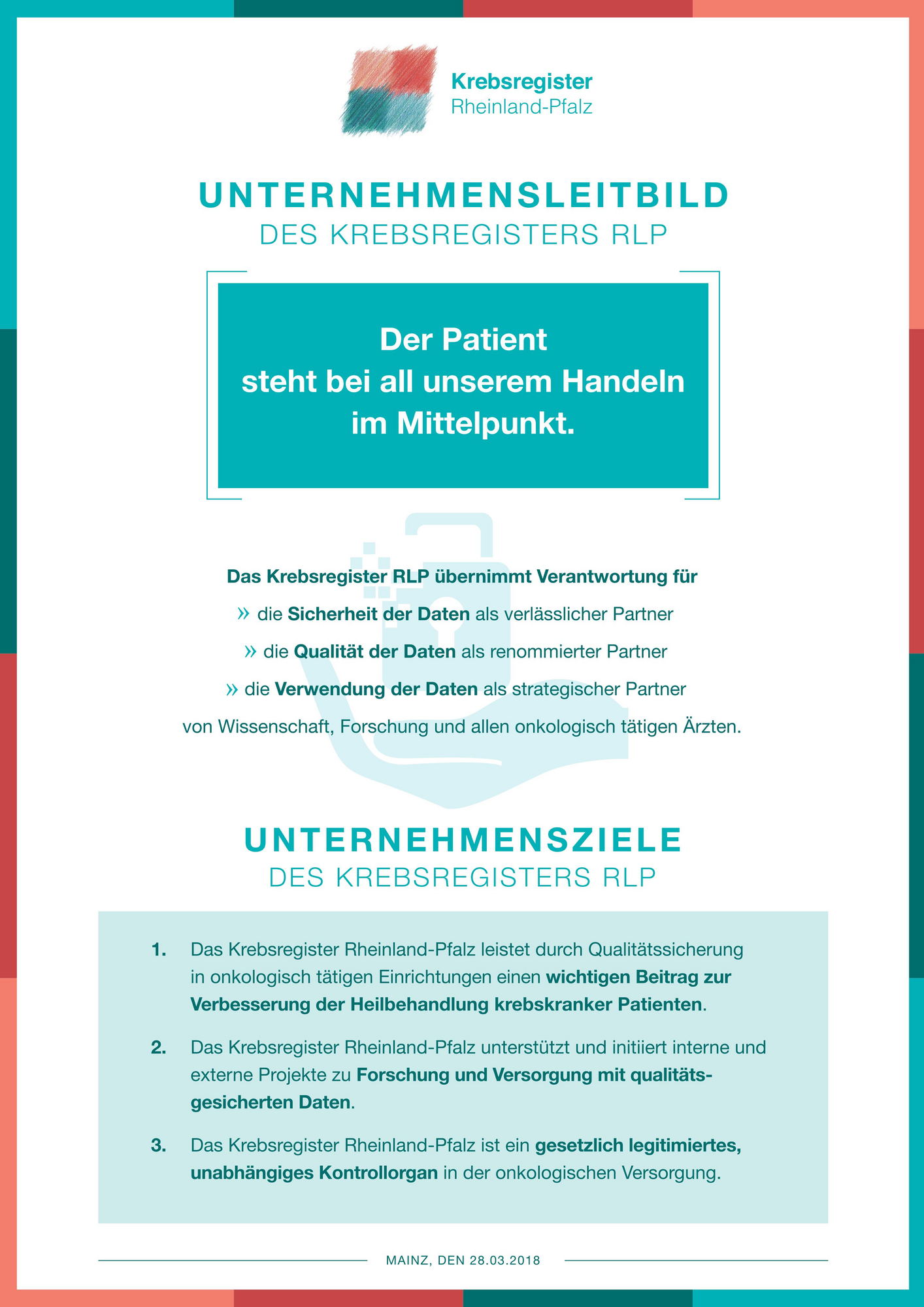 - Die Datenverarbeitung im Krebsregister Rheinland-Pfalz erfolgt streng vertraulich und unterliegt ärztlicher Aufsicht.