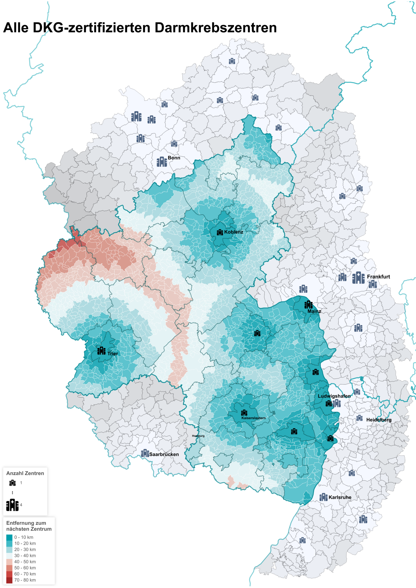 Menschen mit einer Darmkrebsdiagnose stehen heute zahlreiche Therapiemöglichkeiten zur Verfügung, die individuell auf die jeweilige Diagnose abgestimmt sind. Die sogenannte WiZen-Studie³ und auch die Daten des Krebsregisters Rheinland-Pfalz im IDG zeigen, dass die Überlebenschancen von Tumorpatientinnen und -patienten, die sich in einem DKG-zertifizierten Zentrum behandeln lassen, erhöht sind. Daher wird empfohlen, bei einer Darmkrebsdiagnose die Behandlungsoptionen eines zertifizierten Zentrums zu nutzen. Im Jahr 2022 lag der prozentuale Anteil der Patientinnen bei 39,3 Prozent und der Patienten bei 41,4 Prozent, die in Rheinland-Pfalz in einem DKG-zertifiziertem Zentrum behandelt wurden. Einen Überblick über alle Zentren sowie eine übersichtliche Zusammenfassung der bestehenden Versorgungsstrukturen, unter Berücksichtigung von Selbsthilfegruppen und Möglichkeiten der Rehabilitation, finden Patientinnen und Patienten zeitnah in dem vom Institut für digitale Gesundheitsdaten entwickelten Onkologischen Versorgungsatlas.