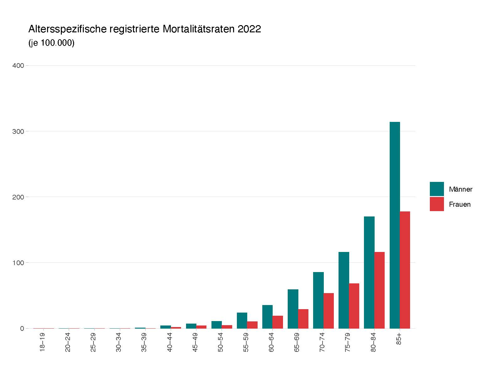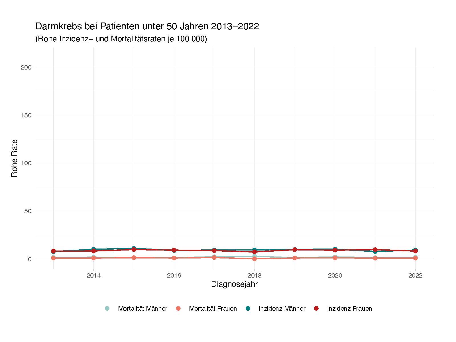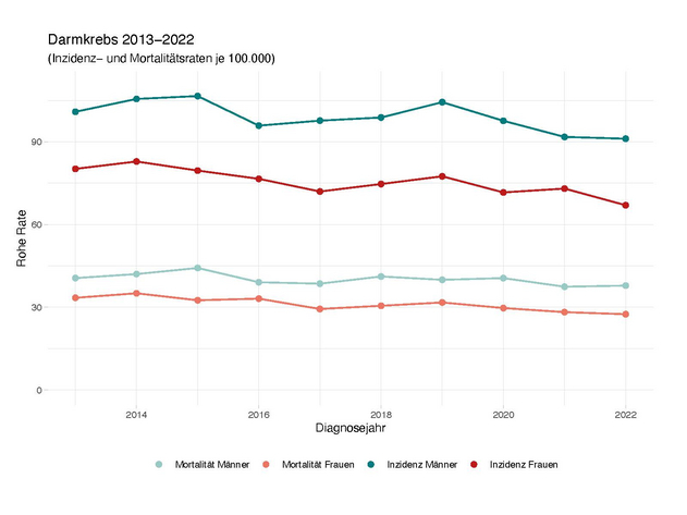Die Mortalität (Anzahl der Sterbefälle in einem bestimmten Zeitraum bezogen auf die Gesamtanzahl der Individuen) bei Darmkrebserkrankungen ist in den letzten Jahren in Rheinland-Pfalz erfreulicherweise gesunken. Trotzdem starben 2022 über 1.100 Menschen an Darmkrebs. Mit 480 Sterbefällen ist Darmkrebs in dem Jahr die vierthäufigste Krebstodesursache bei Frauen. Bei Männern liegt Darmkrebs mit 636 Sterbefällen auf dem dritten Platz der häufigsten Krebstodesursachen.