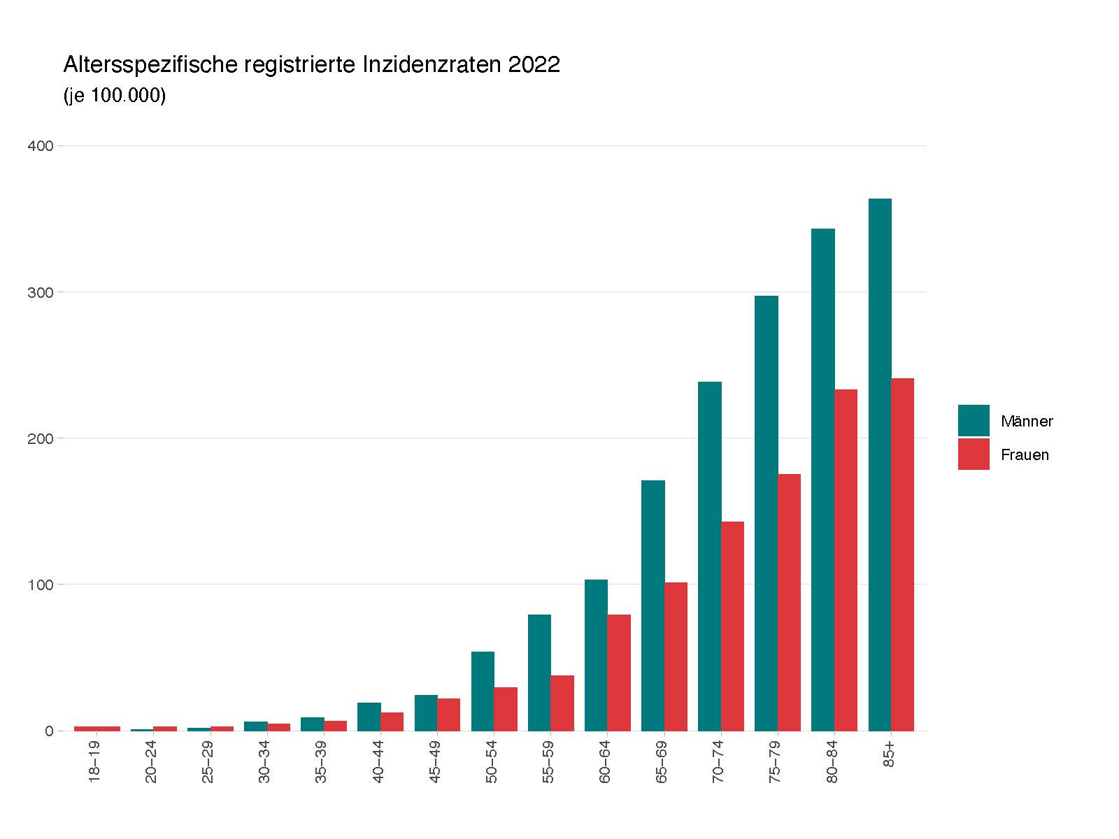 Hauptrisikofaktor für die Erkrankung ist das Alter: Mehr als die Hälfte der Erstdiagnosen entfällt in Rheinland-Pfalz auf Menschen über 70, weniger als 10 Prozent der Krebserkrankungen treten vor dem 50. Lebensjahr auf. Bei Menschen unter 50 konnte in Rheinland-Pfalz entgegen einer europäischen Studie1 zum aktuellen Zeitpunkt keine steigende Inzidenz festgestellt werden.