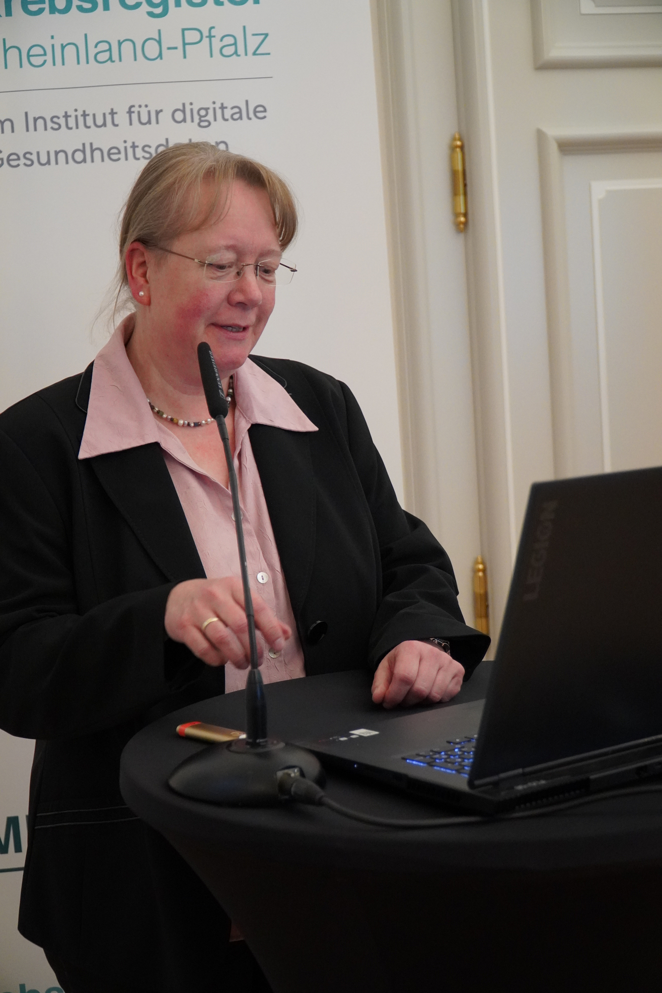 Nach der ersten lebhaften Podiumsdiskussion folgte nach einer kurzen Pause der Vortrag von Dr. Katja Schwarzer, Ärztliche Leiterin des IDG. Sie stellte das IDG insbesondere als Partner für Ärztinnen und Ärzte und medizinische Einrichtungen vor. Unter den vielfältigen Serviceangeboten finden sich beispielsweise ein Medizinischer Dokumentationsservice (MEDoServ), der die medizinischen Einrichtungen die Krebsregistermeldungen abnimmt oder bei der Vorbereitung von Tumorkonferenzen sowie bei Zertifizierungsaudits unterstützt. Außerdem bietet das IDG den Aufbau und Betrieb von medizinischen Registern an.
